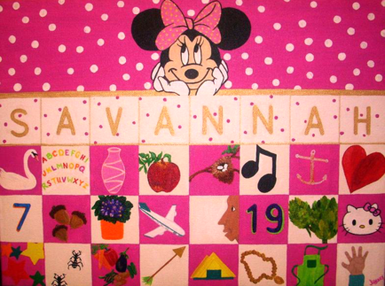 Just give us a name and the child's favorite color or "thing", then we will "picture" it. These are original hand painted pieces of a child's history, not prints. Paintings can be wiped off with a damp cloth to remove dust. Don't forget, when you hang a painting for a child, make sure it's hung close to their eye level.